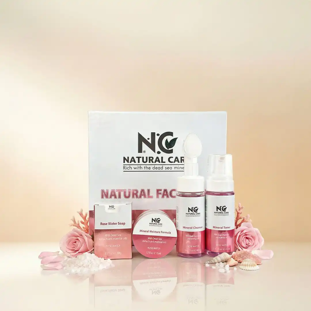 طقم العناية بالبشرة – NC FACE CARE: طقوس الجمال الطبيعي من البحر الميت وماء الورد باكيج متكامل يجمع بين منظف الوجه، التونر، الكريم المرطب، وصابونة ماء الورد روتين عناية فاخر يمنح بشرتكِ إشراقة وردية ونقاء لا يقاوم من ناتشرال كير عمان!