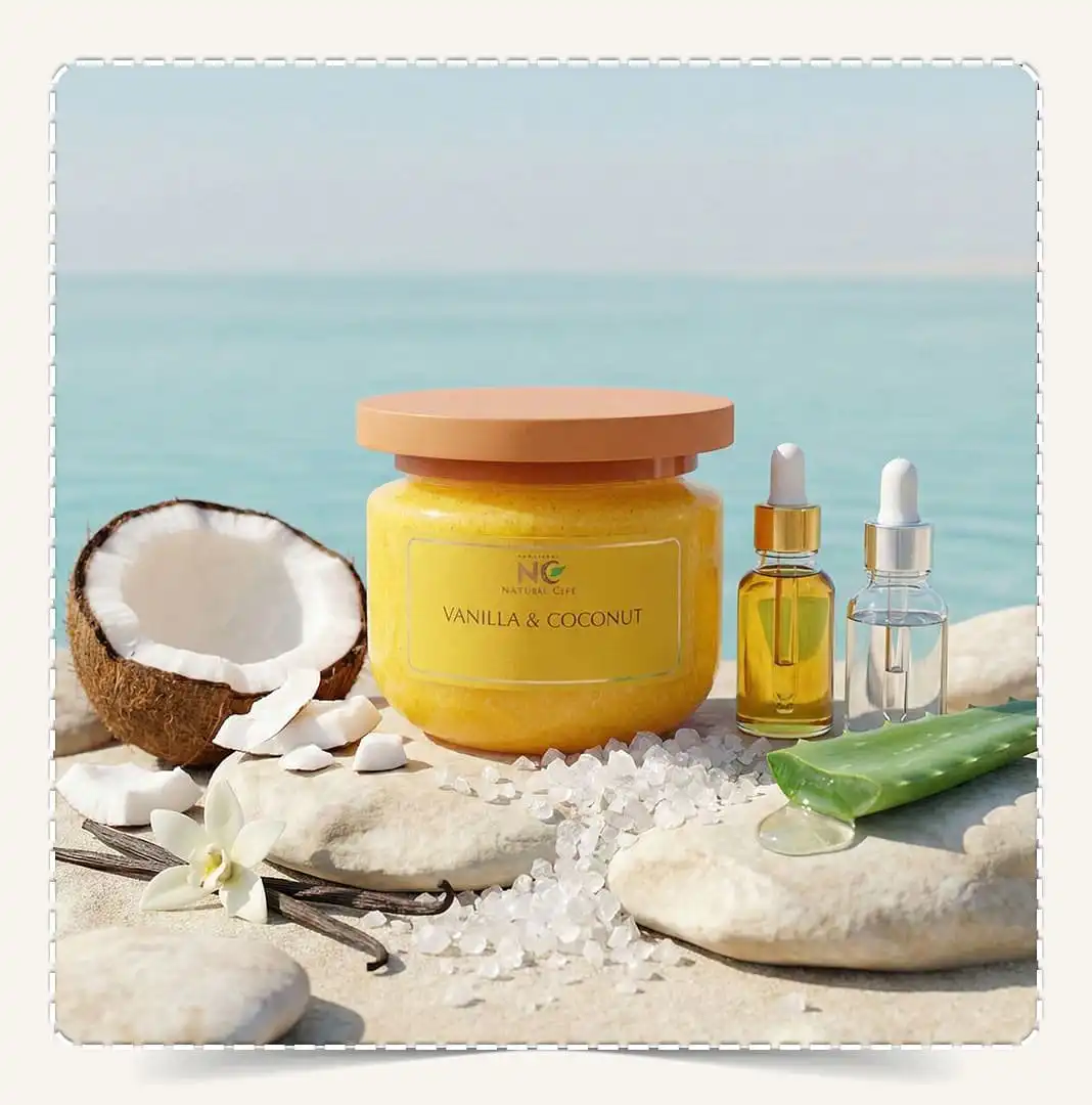 مقشر جسم طبيعي بزيت جوز الهند والفانيليا Natural Body Scrub Vanilla & Coconut، امنحي بشرتك لحظة دلال استوائية مع مقشر الجسم بزيت جوز الهند والفانيليا من ناتشرال كير، تركيبة فاخرة تجمع بين أملاح البحر الميت الطبيعية والزيوت الطبيعية والرائحة الدافئة المنعشة لمزيج جوز الهند والفانيليا.